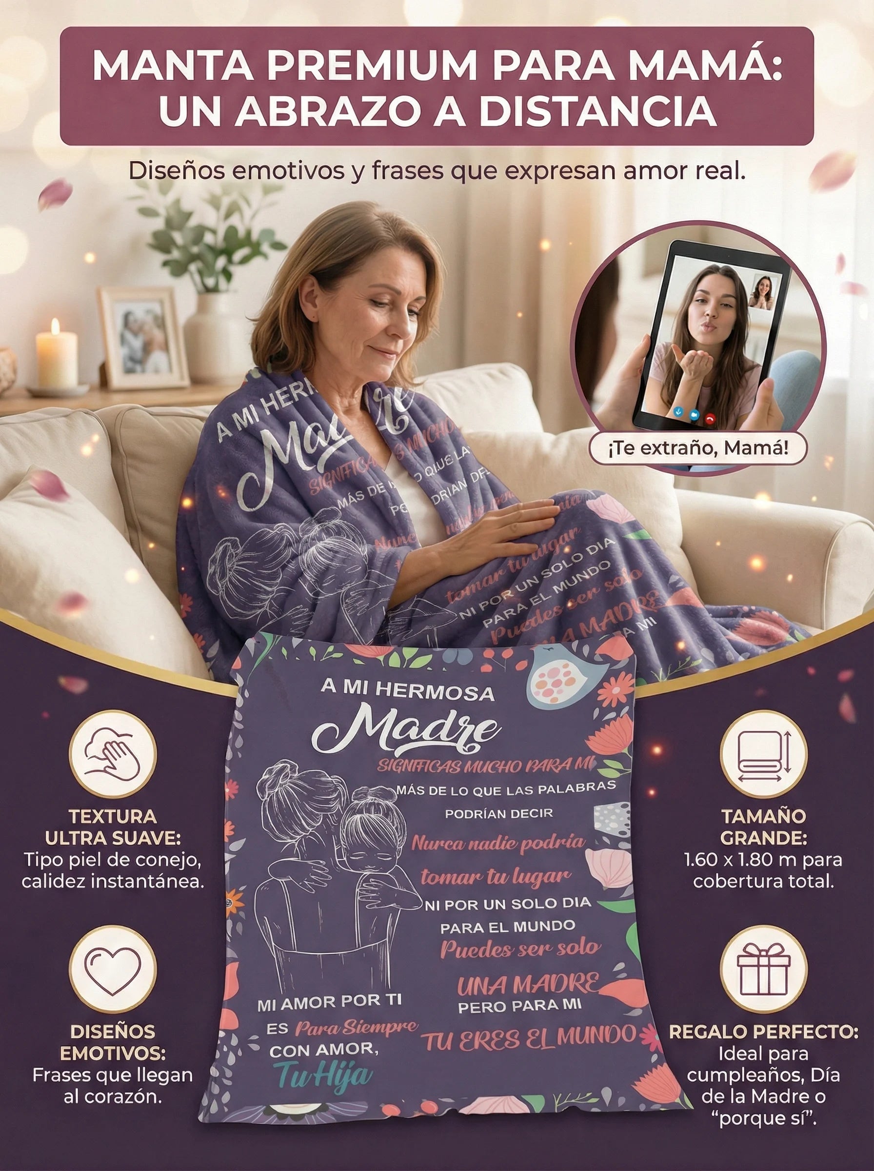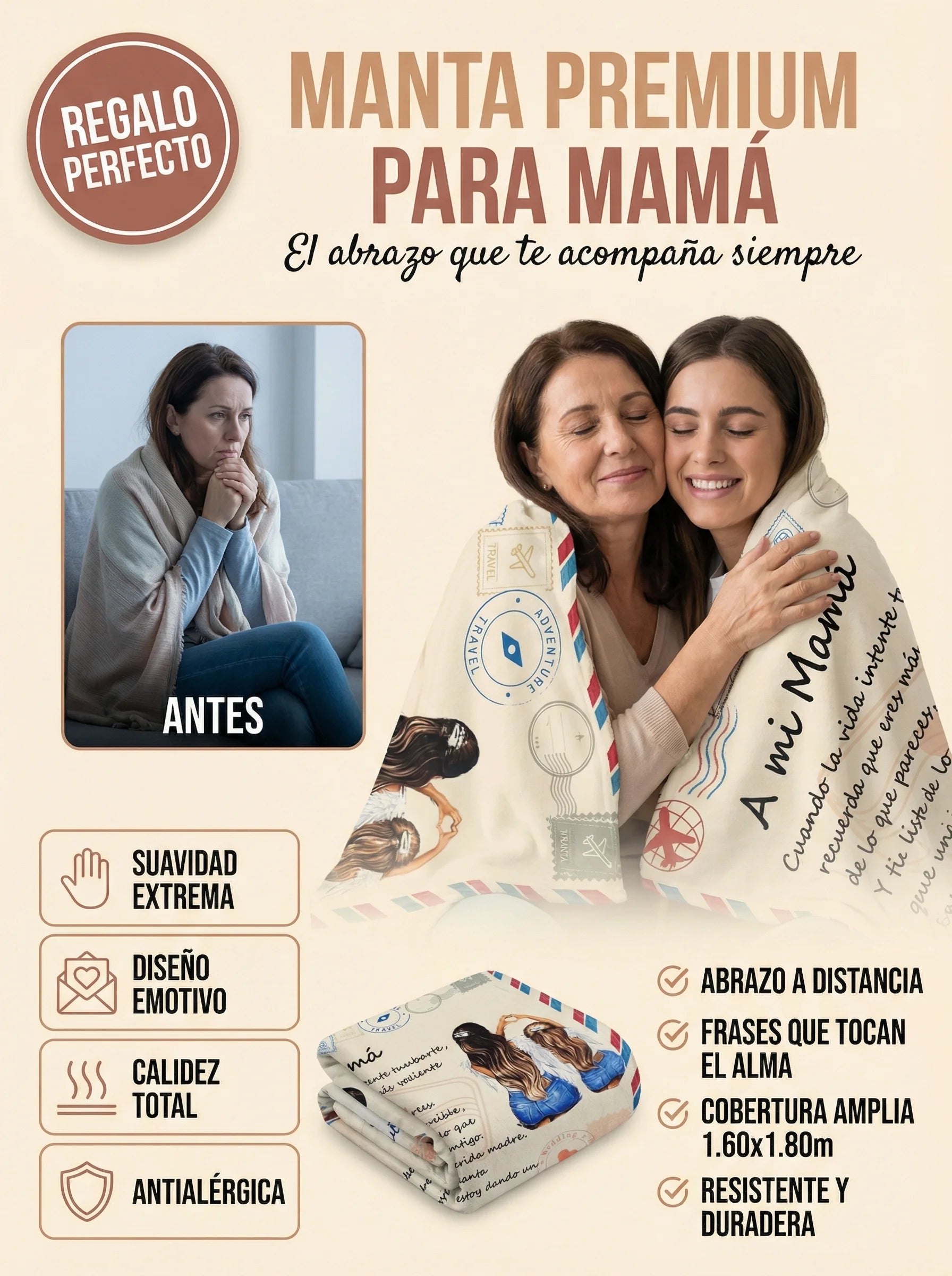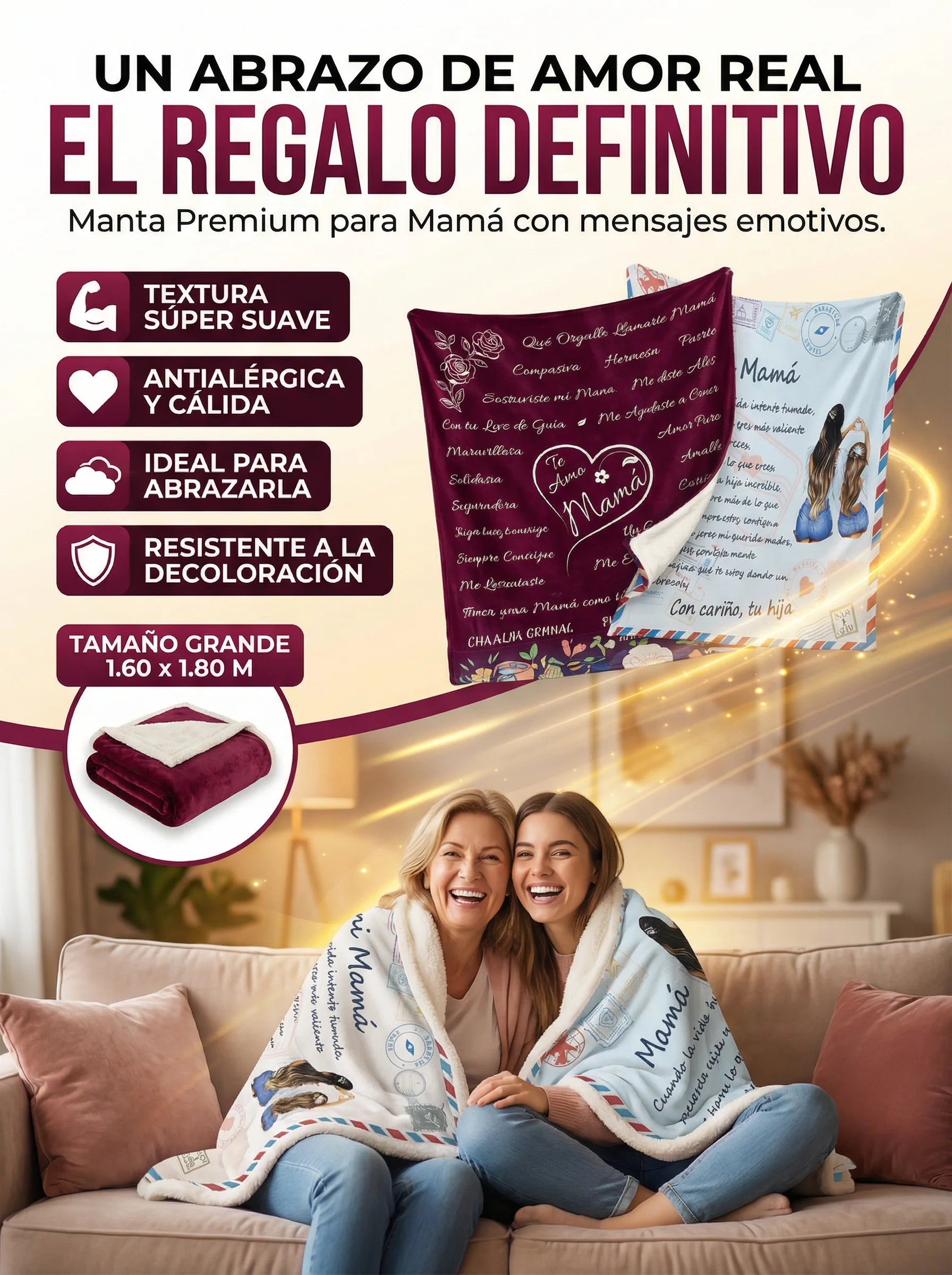 Mide 1.60 x 1.80 m, ideal para cubrir el cuerpo completo en cama o sofá.