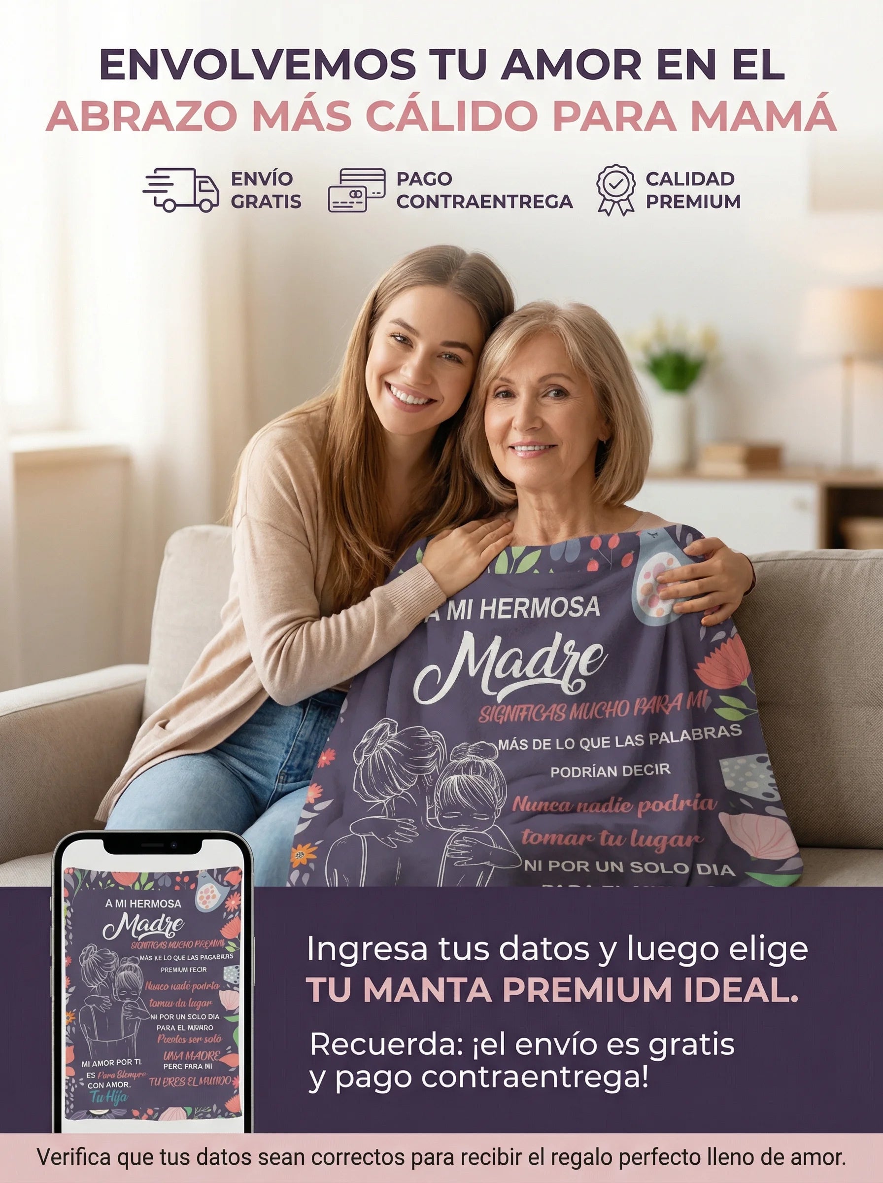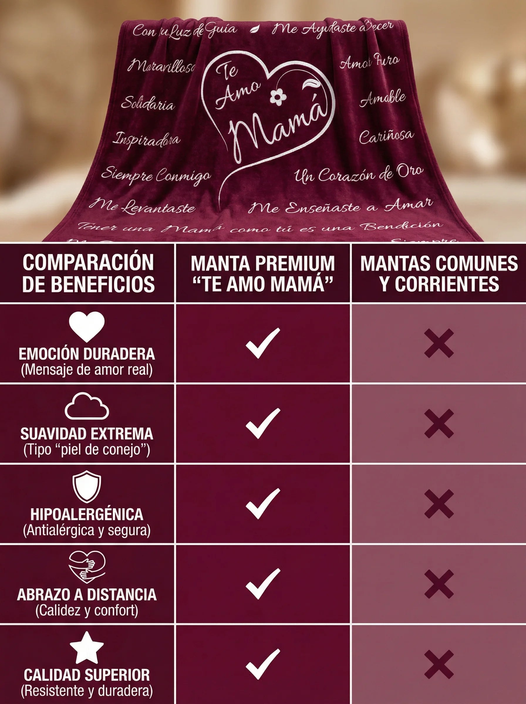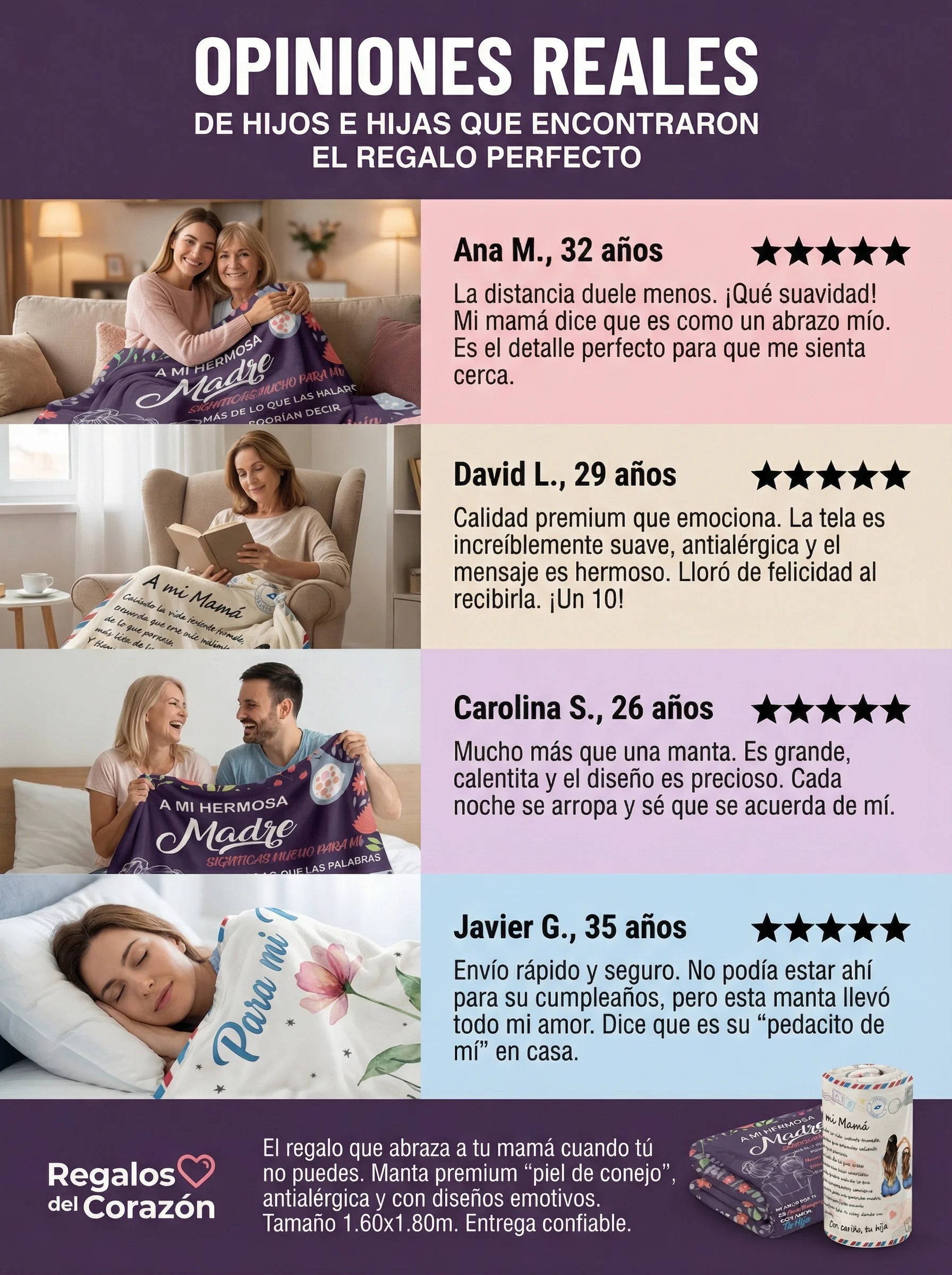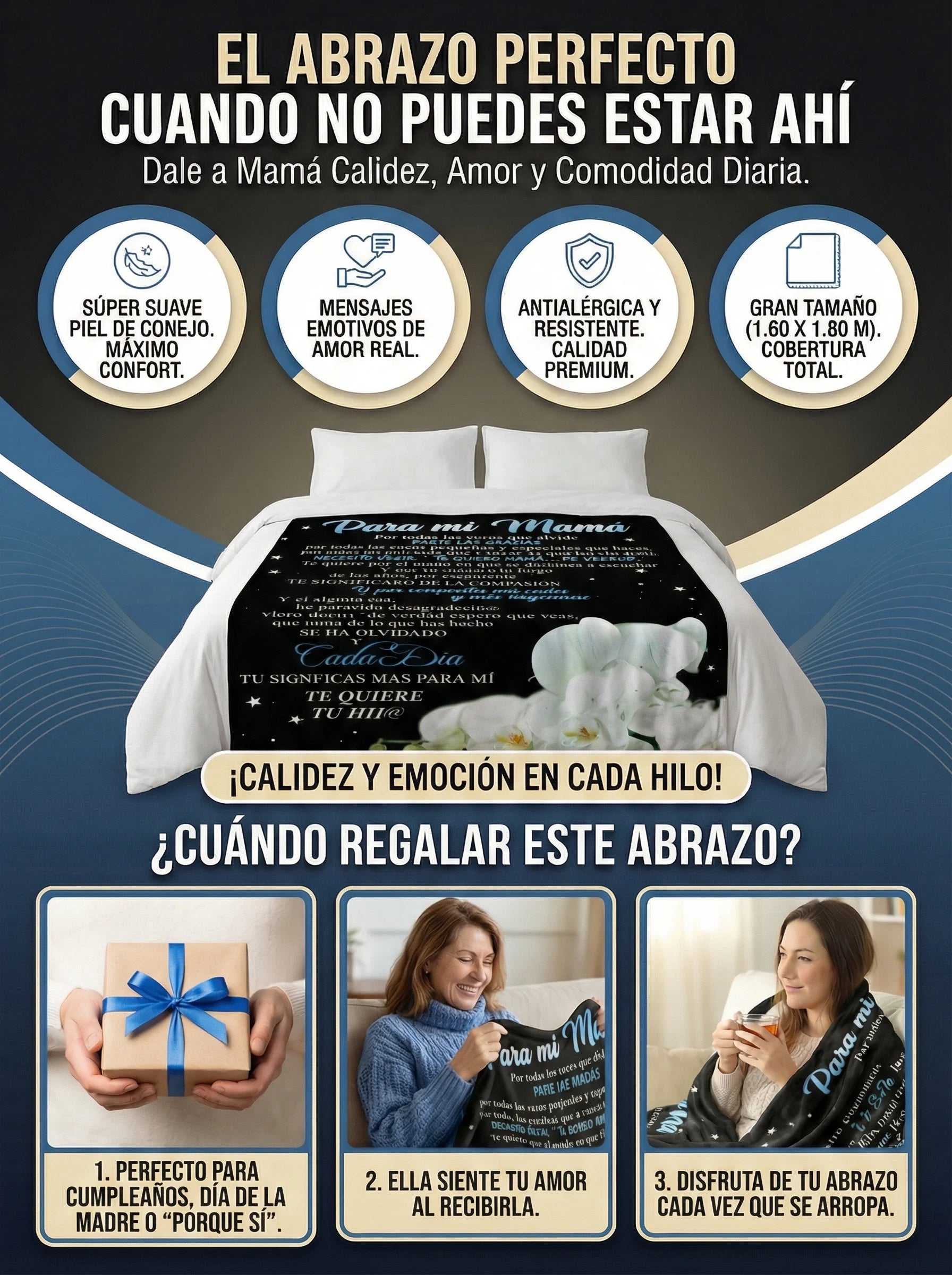 Mide 1.60 x 1.80 m, ideal para cubrir el cuerpo completo en cama o sofá.